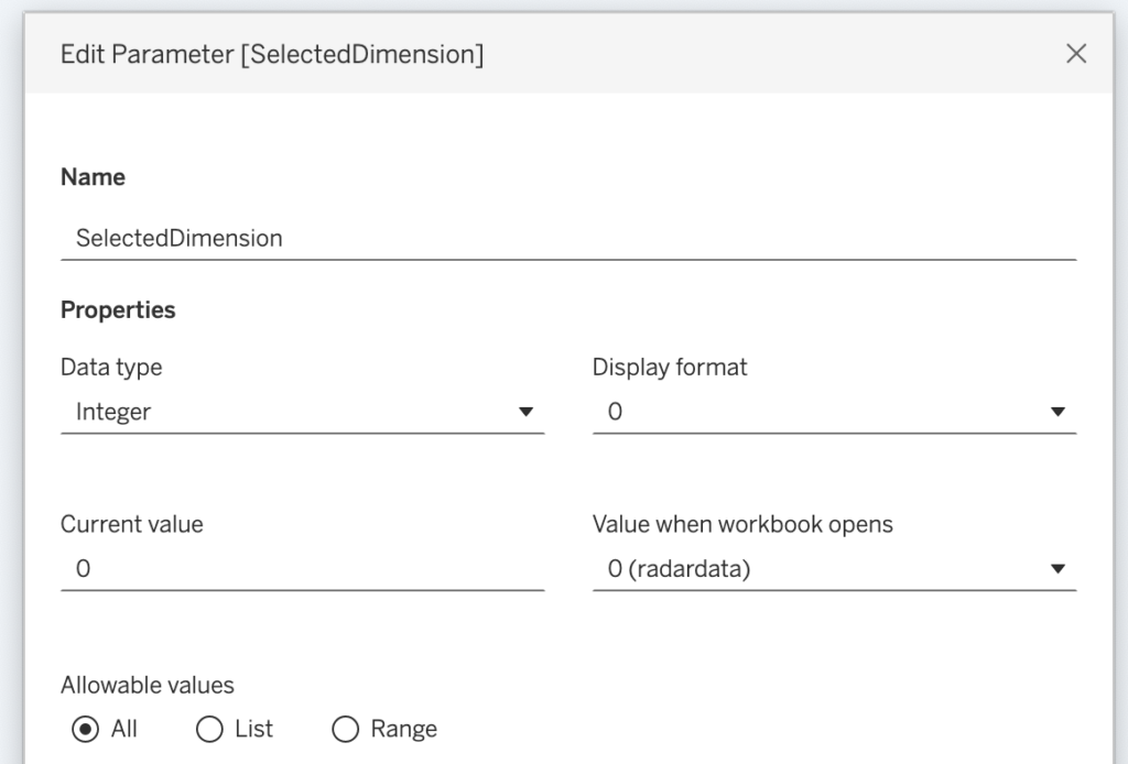 Before we touch a single calculation, we have to rethink how Tableau handles this idea. A normal filter would destroy the idea of a radar chart (because only one spoke/dimension is left). To create a “zoom” we have to exploit three specific Tableau behaviors (and strengths):