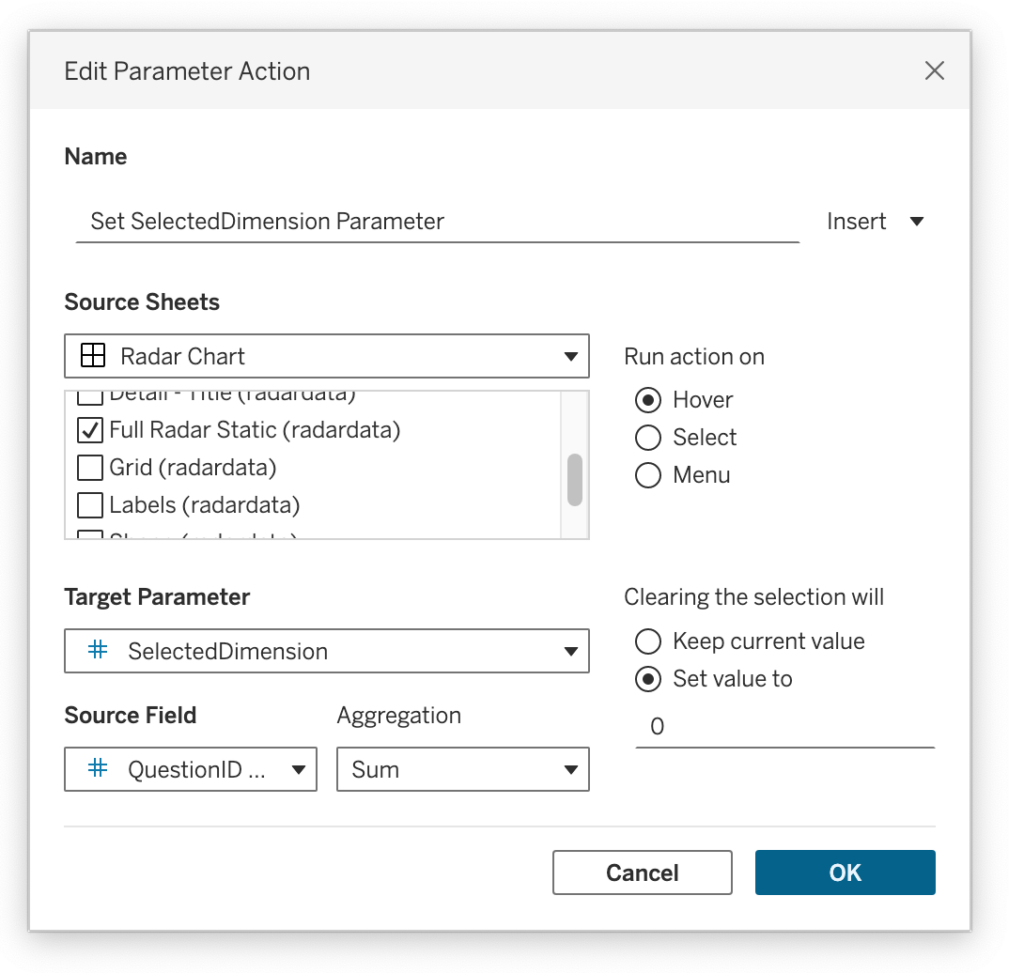 The final step is a Parameter Action. When you hover over a spoke, the SelectedDimension parameter updates to that DimensionID, triggering the zoom. Once the cursor moves away, the value resets to 0, hiding the popup and returning the dashboard to its clean, original state.