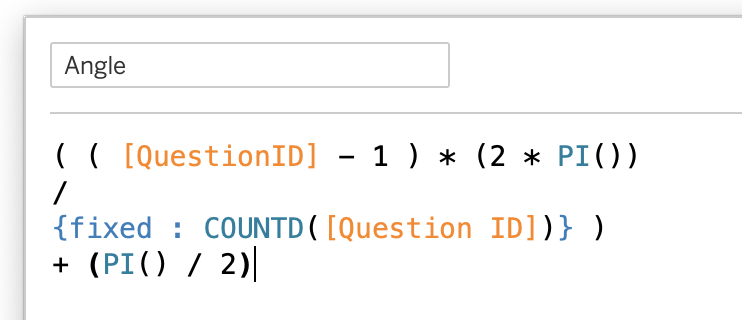 ([QuestionID]-1) * (2 * PI()) / {FIXED: COUNTD([QuestionID])} + (PI() / 2)