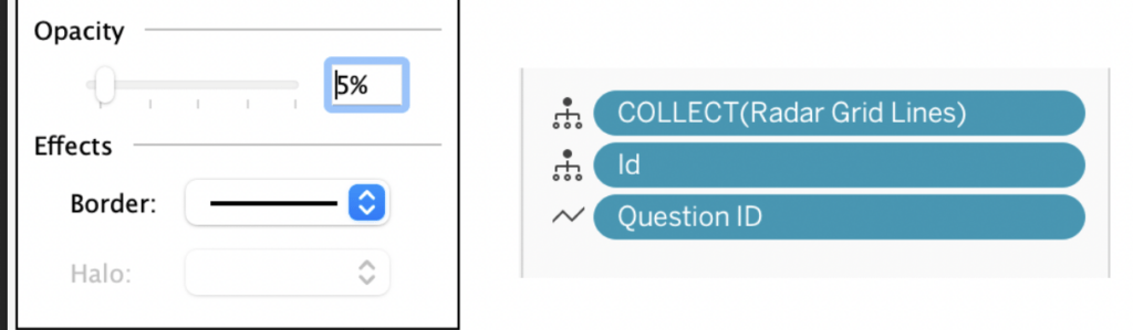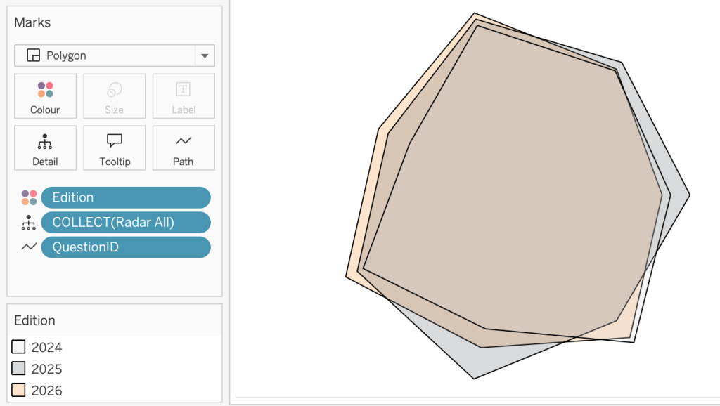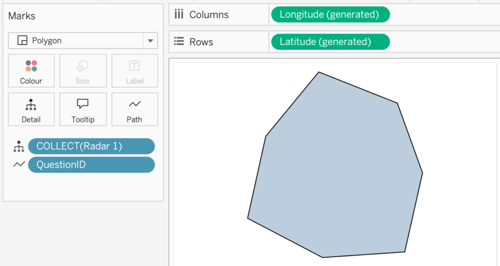 Using two calculations – Radar 1 and QuestionId, the visualization can be build.