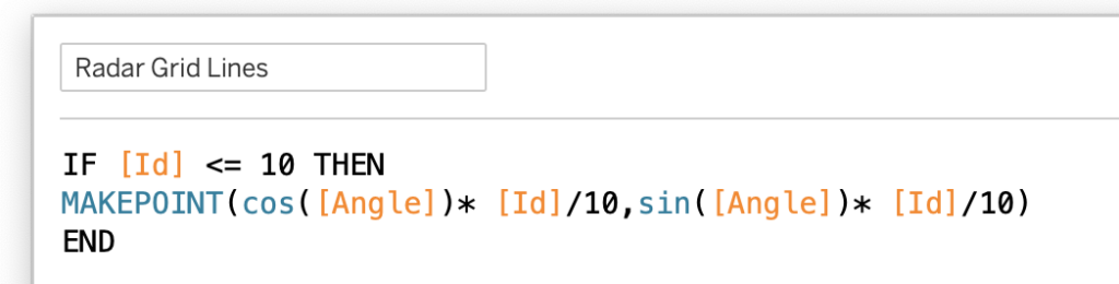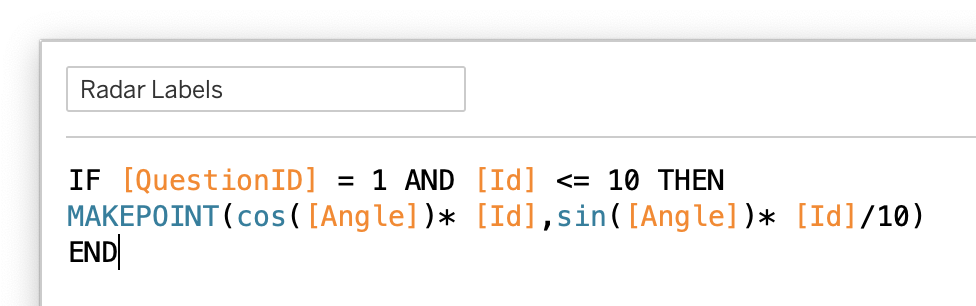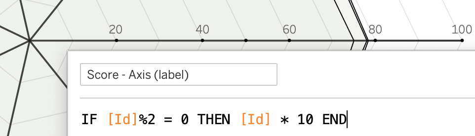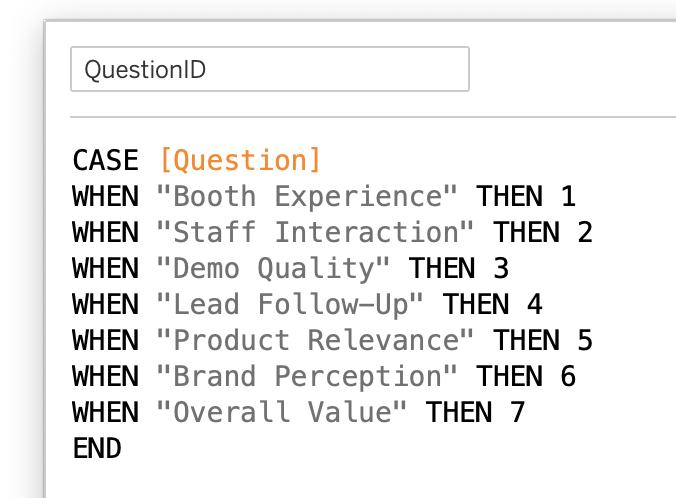 Each dimension (Question) needs a unique numeric ID to determine its order around the radar. If your dataset doesn’t have one, you can create a calculation with a simple CASE statement: